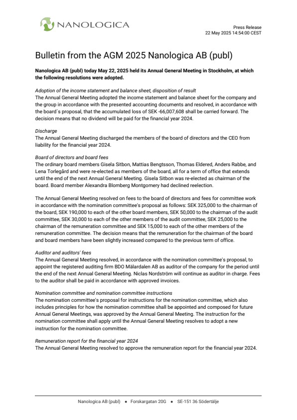 Nanologica AB (publ) today May 22, 2025 held its Annual General Meeting in Stockholm, at which the following resolutions were adopted.