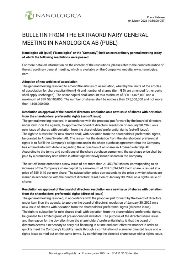 Nanologica AB (publ) ("Nanologica" or the "Company") held an extraordinary general meeting today at which the following resolutions were passed.
