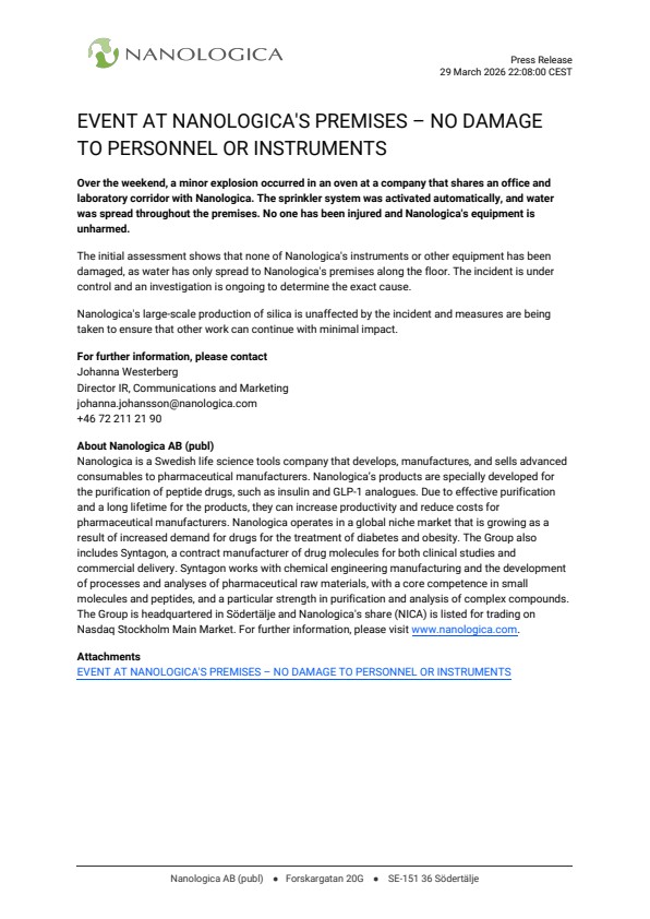 Nanologica's large-scale production of silica is unaffected by the incident and measures are being taken to ensure that other work can continue with minimal impact.