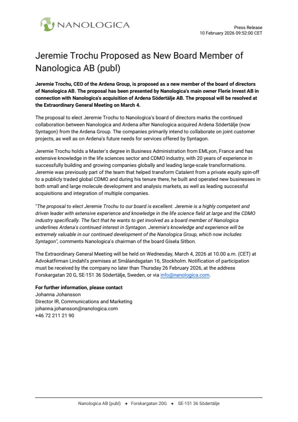 Jeremie Trochu, CEO of the Ardena Group, is proposed as a new member of the board of directors of Nanologica AB. The proposal has been presented by Nanologica's main owner Flerie Invest AB in connection with Nanologica's acquisition of Ardena Södertälje AB. The proposal will be resolved at the Extraordinary General Meeting on March 4.
