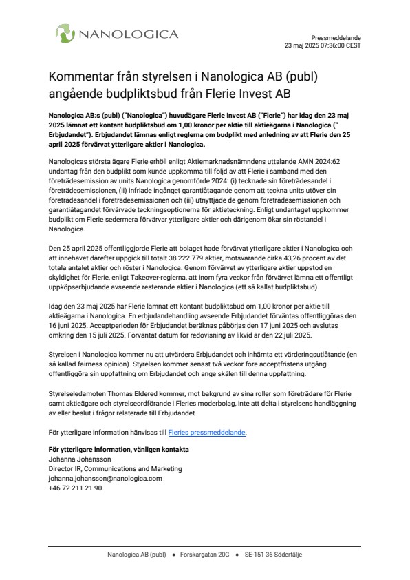 Idag den 23 maj 2025 har Flerie lämnat ett kontant budpliktsbud om 1,00 kronor per aktie till aktieägarna i Nanologica. En erbjudandehandling avseende Erbjudandet förväntas offentliggöras den 16 juni 2025. Acceptperioden för Erbjudandet beräknas påbörjas den 17 juni 2025 och avslutas omkring den 15 juli 2025. Förväntat datum för redovisning av likvid är den 22 juli 2025.