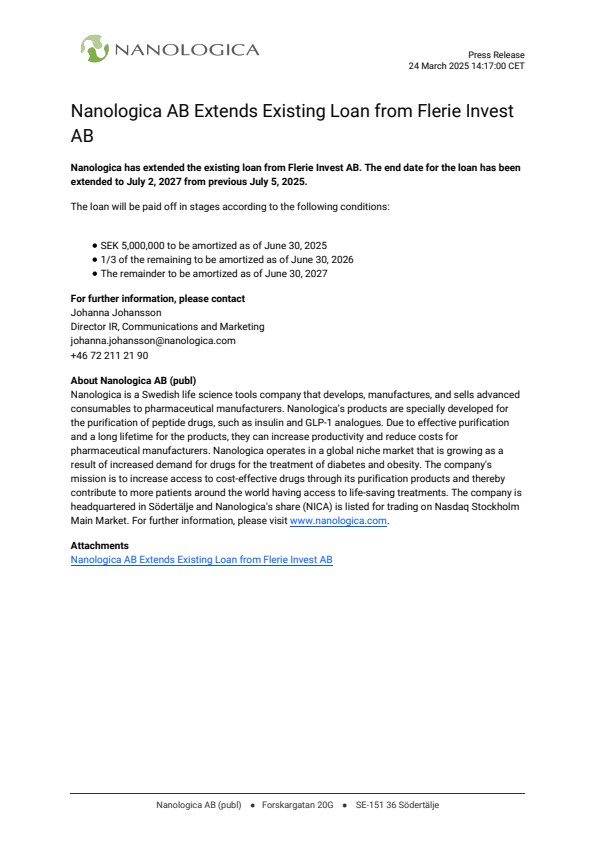 Nanologica has extended the existing loan from Flerie Invest AB. The end date for the loan has been extended to July 2, 2027 from previous July 5, 2025.