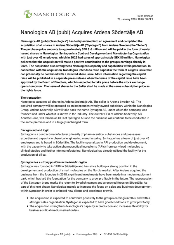 Nanologica AB (publ) ("Nanologica") has today entered into an agreement and completed the acquisition of all shares in Ardena Södertälje AB ("Syntagon") from Ardena Sweden (the "Seller"). The purchase price amounts to approximately SEK 8.6 million and will be paid in the form of newly issued shares in Nanologica. Syntagon is a Contract Development and Manufacturing Organization with just over 45 employees, which in 2025 had sales of approximately SEK 80 million. Nanologica believes that the acquisition will make a positive contribution to the group's earnings already in 2026. The acquisition also strengthens Nanologica's capacity and capabilities within production. In connection with the acquisition, Nanologica intends to raise capital in the form of a rights issue that can potentially be combined with a directed share issue. More information regarding the capital raise will be published in a separate press release when the terms of the capital raise have been approved by the Board of Directors, which is expected to take place before the stock exchange opens tomorrow. The issue of shares to the Seller shall be made at the same subscription price as the rights issue.
