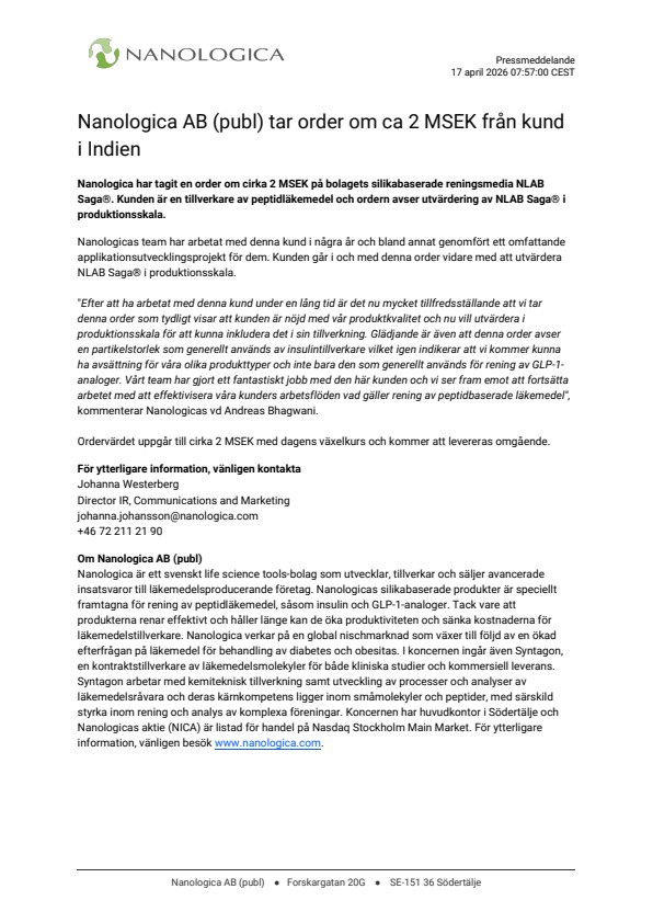 "Efter att ha arbetat med denna kund under en lång tid är det nu mycket tillfredsställande att vi tar denna order som tydligt visar att kunden är nöjd med vår produktkvalitet och nu vill utvärdera i produktionsskala för att kunna inkludera det i sin tillverkning. Glädjande är även att denna order avser en partikelstorlek som generellt används av insulintillverkare vilket igen indikerar att vi kommer kunna ha avsättning för våra olika produkttyper och inte bara den som generellt används för rening av GLP-1-analoger. Vårt team har gjort ett fantastiskt jobb med den här kunden och vi ser fram emot att fortsätta arbetet med att effektivisera våra kunders arbetsflöden vad gäller rening av peptidbaserade läkemedel", kommenterar Nanologicas vd Andreas Bhagwani.