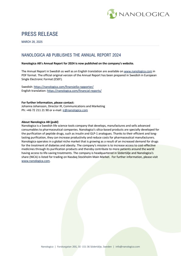 Nanologica AB's Annual Report for 2024 is now published on the company's website.