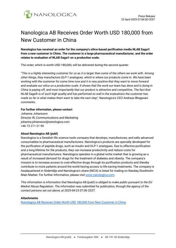 ”This is a highly interesting customer for us as it is larger than some of the others we work with. Among other things, they manufacture GLP-1 analogues, which is where our products come in. We have been working with the customer for some time now and it is very positive that they want to move forward and evaluate our silica on a production scale. It shows that the work our team has done and is doing in China is paying off, and most importantly that our product is attractive and competitive. The fact that NLAB Saga® is of such high quality and has performed so well in the evaluations the customer has made so far is what makes them want to take the next step", Nanologica's CEO Andreas Bhagwani comments.