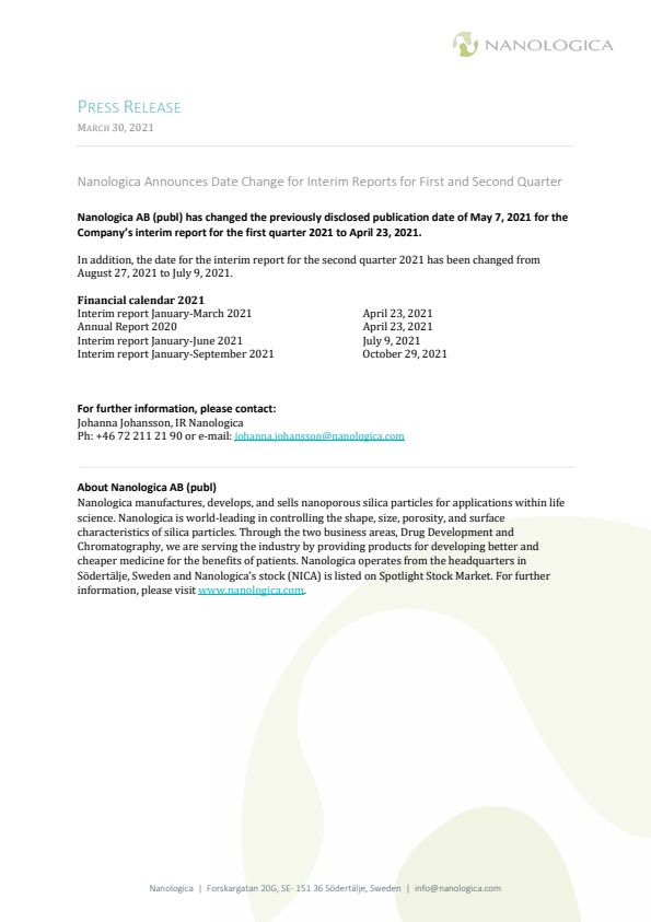 Nanologica manufactures, develops, and sells nanoporous silica particles for applications within life science. Nanologica is world-leading in controlling the shape, size, porosity, and surface characteristics of silica particles. Through the two business areas, Drug Development and Chromatography, we are serving the industry by providing products for developing better and cheaper medicine for the benefits of patients. Nanologica operates from the headquarters in Södertälje, Sweden and Nanologica’s stock (NICA) is listed on Spotlight Stock Market. For further information, please visit www.nanologica.com.