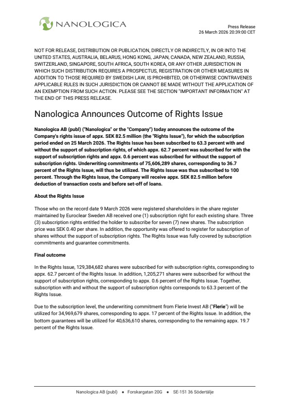 Nanologica AB (publ) ("Nanologica" or the "Company") today announces the outcome of the Company's rights issue of appx. SEK 82.5 million (the "Rights Issue"), for which the subscription period ended on 25 March 2026. The Rights Issue has been subscribed to 63.3 percent with and without the support of subscription rights, of which appx. 62.7 percent was subscribed for with the support of subscription rights and appx. 0.6 percent was subscribed for without the support of subscription rights. Underwriting commitments of 75,606,289 shares, corresponding to 36.7 percent of the Rights Issue, will thus be utilized. The Rights Issue was thus subscribed to 100 percent. Through the Rights Issue, the Company will receive appx. SEK 82.5 million before deduction of transaction costs and before set-off of loans.