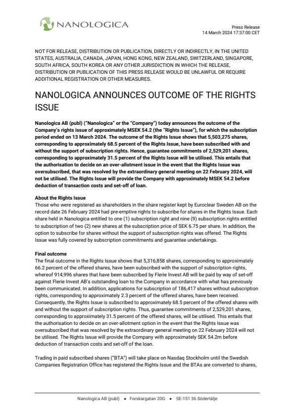 Nanologica AB (publ) (“Nanologica” or the “Company”) today announces the outcome of the Company’s rights issue of approximately MSEK 54.2 (the ”Rights Issue”), for which the subscription period ended on 13 March 2024. The outcome of the Rights Issue shows that 5,503,275 shares, corresponding to approximately 68.5 percent of the Rights Issue, have been subscribed with and without the support of subscription rights. Hence, guarantee commitments of 2,529,201 shares, corresponding to approximately 31.5 percent of the Rights Issue will be utilised. This entails that the authorisation to decide on an over-allotment issue in the event that the Rights Issue was oversubscribed, that was resolved by the extraordinary general meeting on 22 February 2024, will not be utilised. The Rights Issue will provide the Company with approximately MSEK 54.2 before deduction of transaction costs and set-off of loan.