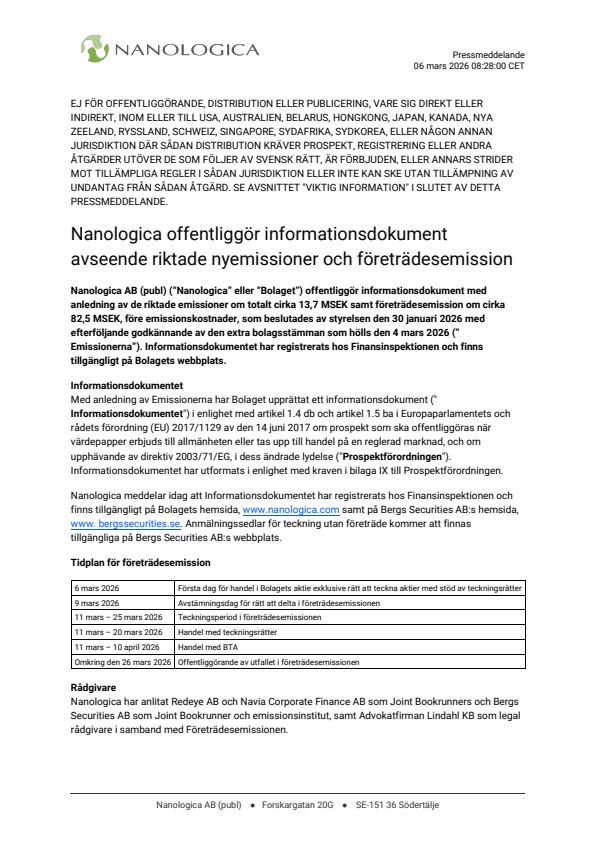 Nanologica AB (publ) (“Nanologica” eller “Bolaget”) offentliggör informationsdokument med anledning av de riktade emissioner om totalt cirka 13,7 MSEK samt företrädesemission om cirka 82,5 MSEK, före emissionskostnader, som beslutades av styrelsen den 30 januari 2026 med efterföljande godkännande av den extra bolagsstämman som hölls den 4 mars 2026 (”Emissionerna”). Informationsdokumentet har registrerats hos Finansinspektionen och finns tillgängligt på Bolagets webbplats.