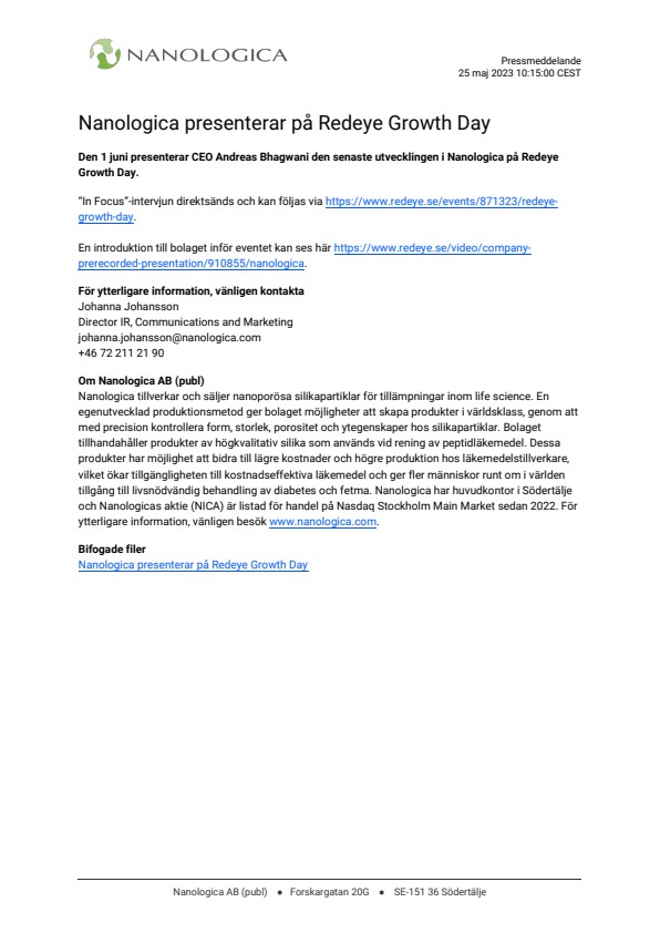 Den 1 juni presenterar CEO Andreas Bhagwani den senaste utvecklingen i Nanologica på Redeye Growth Day.
