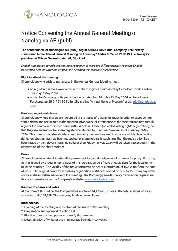 The shareholders of Nanologica AB (publ), org.nr 556664-5023 (the "Company") are hereby summoned to the Annual General Meeting on Thursday 16 May 2024, at 12.00 CET, at Redeye's premises at Mäster Samuelsgatan 42, Stockholm.