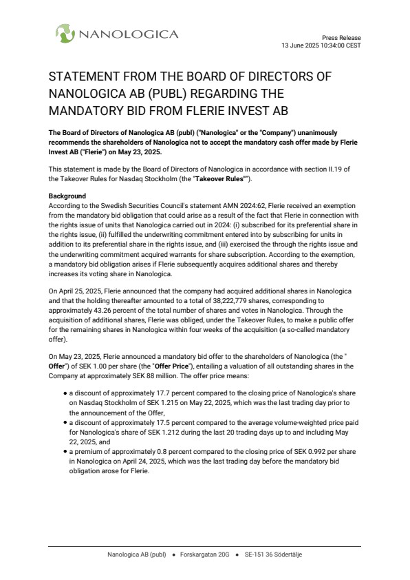 The Board of Directors of Nanologica AB (publ) ("Nanologica" or the "Company") unanimously recommends the shareholders of Nanologica not to accept the mandatory cash offer made by Flerie Invest AB ("Flerie") on May 23, 2025.
