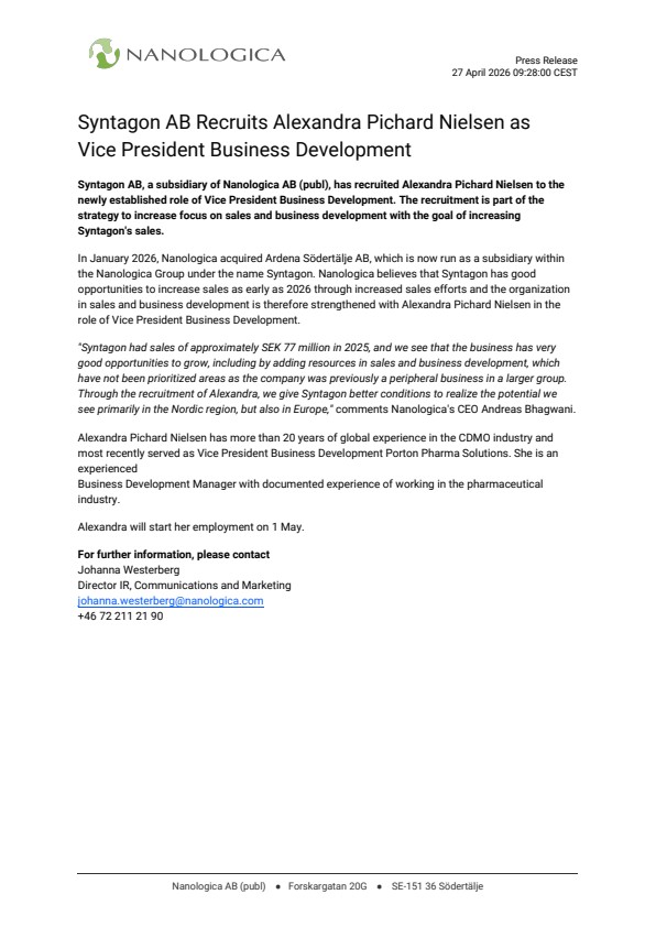 "Syntagon had sales of approximately SEK 77 million in 2025, and we see that the business has very good opportunities to grow, including by adding resources in sales and business development, which have not been prioritized areas as the company was previously a peripheral business in a larger group. Through the recruitment of Alexandra, we give Syntagon better conditions to realize the potential we see primarily in the Nordic region, but also in Europe," comments Nanologica's CEO Andreas Bhagwani.