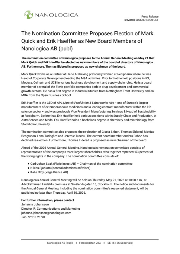 The nomination committee of Nanologica proposes to the Annual General Meeting on May 21 that Mark Quick and Erik Haeffler be elected as new members of the board of directors of Nanologica AB. Furthermore, Thomas Eldered is proposed as new chairman of the board.
